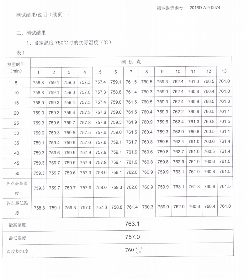 2016年9月上海檢測機構對爐溫均勻性進行了檢測,實際溫度值均在±4℃內范圍內,符合GB/T 9452-2012<熱處理爐有效加熱區(qū)測定方法》中規(guī)定的技術要求。